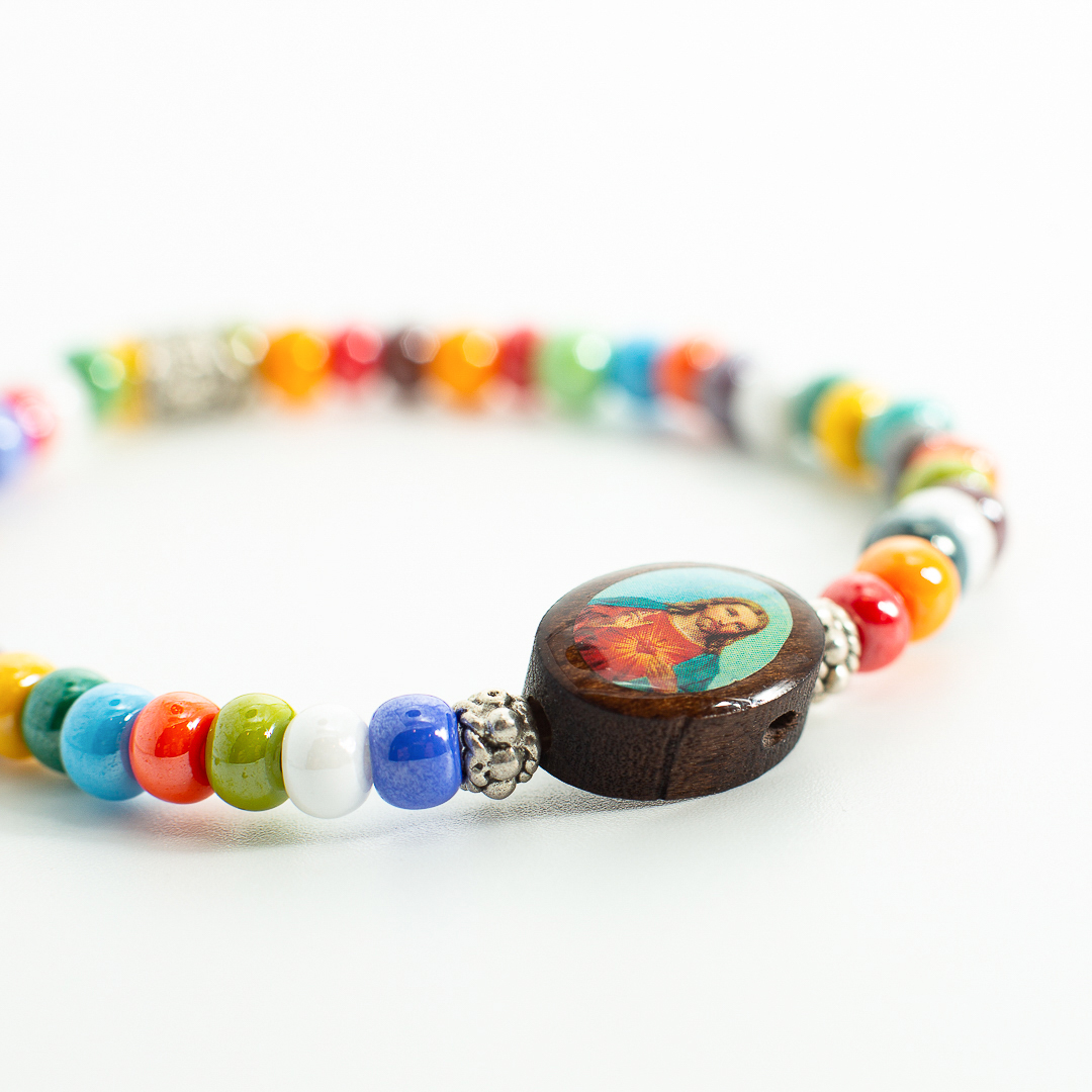 Bracciale in perle di Murano multicolor 4/6mm e accessori in bronzo bianco con icona in legno “Jesus