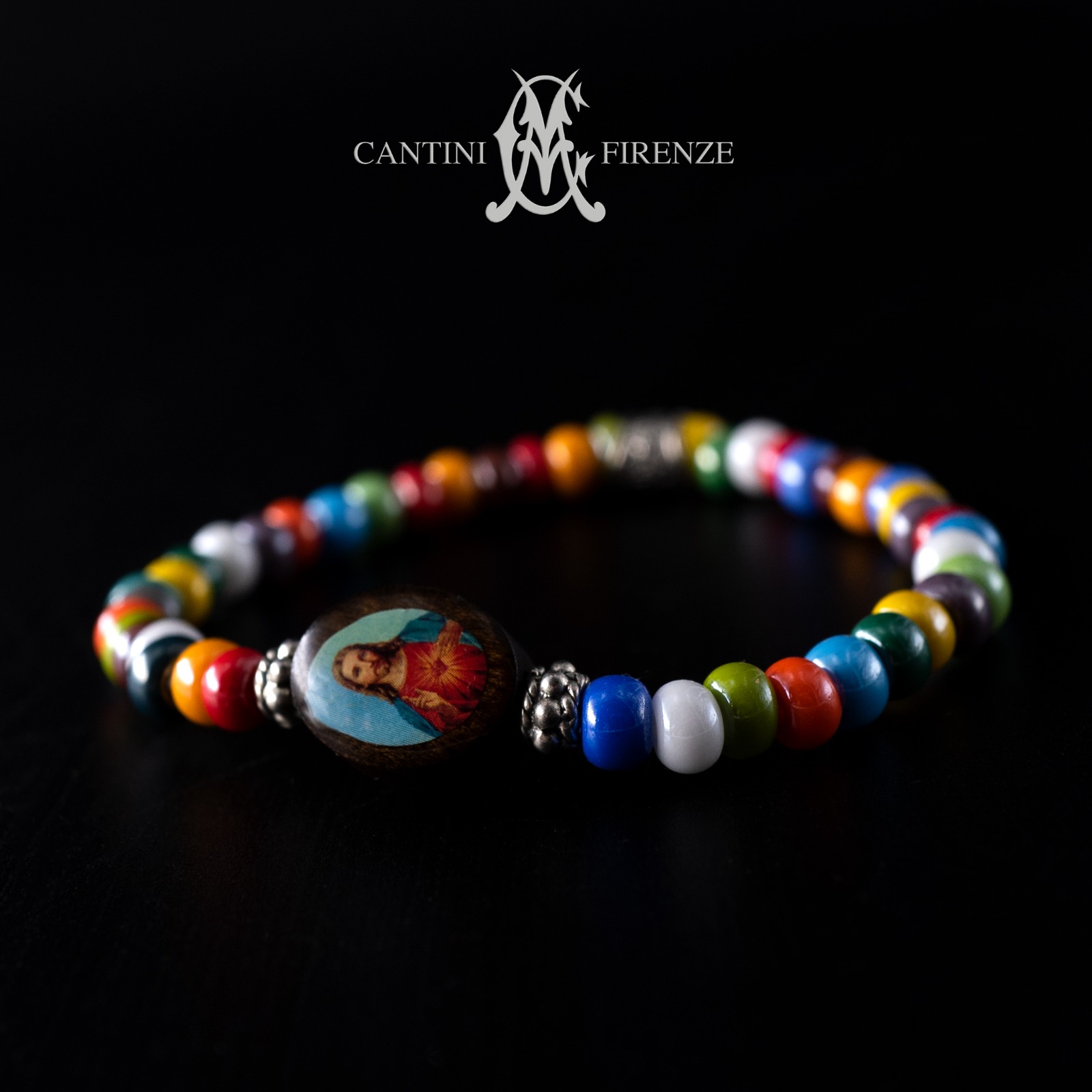 Bracelet in multicolor Murano beads 4 / 6mm and accessories in white bronze with wooden icon “Jesus