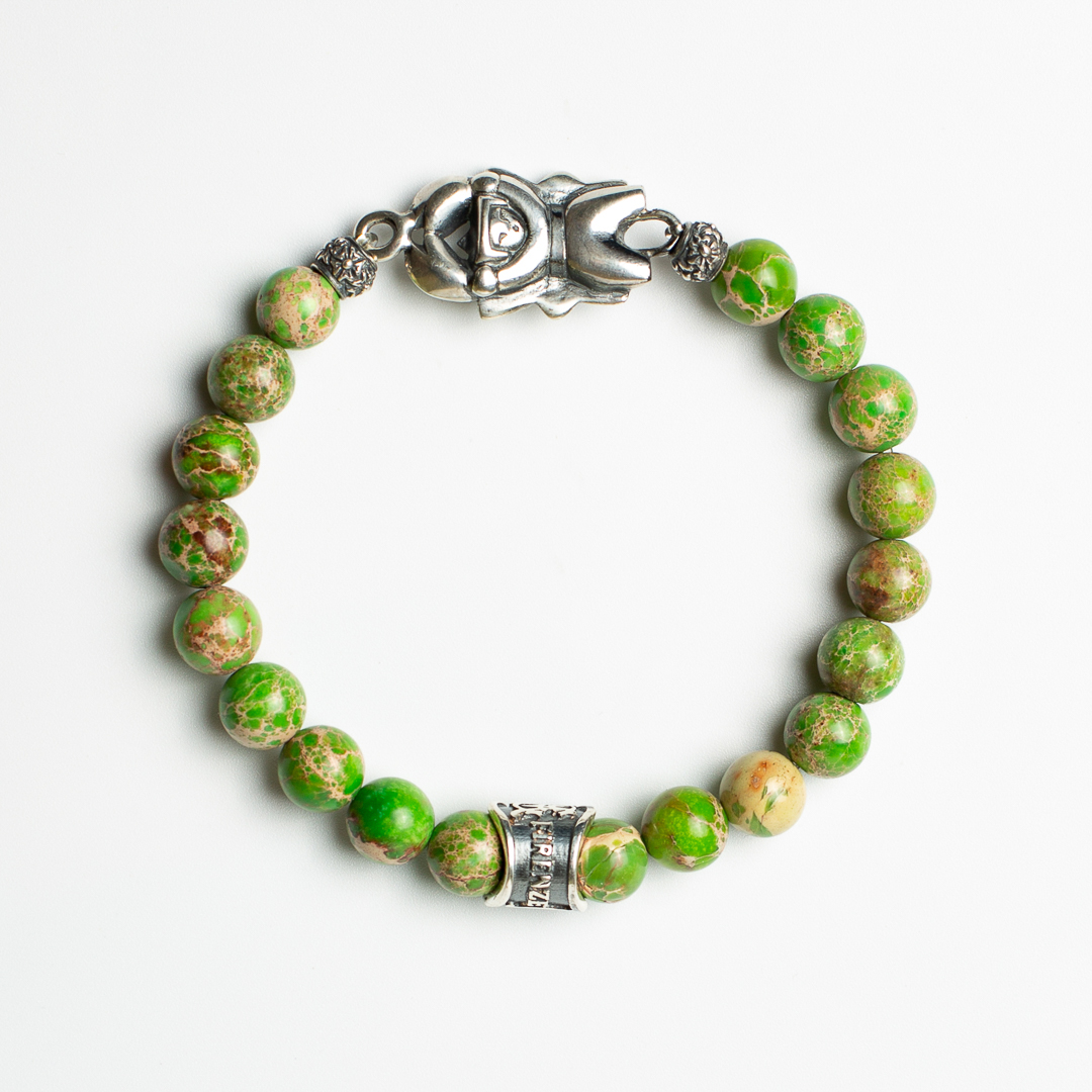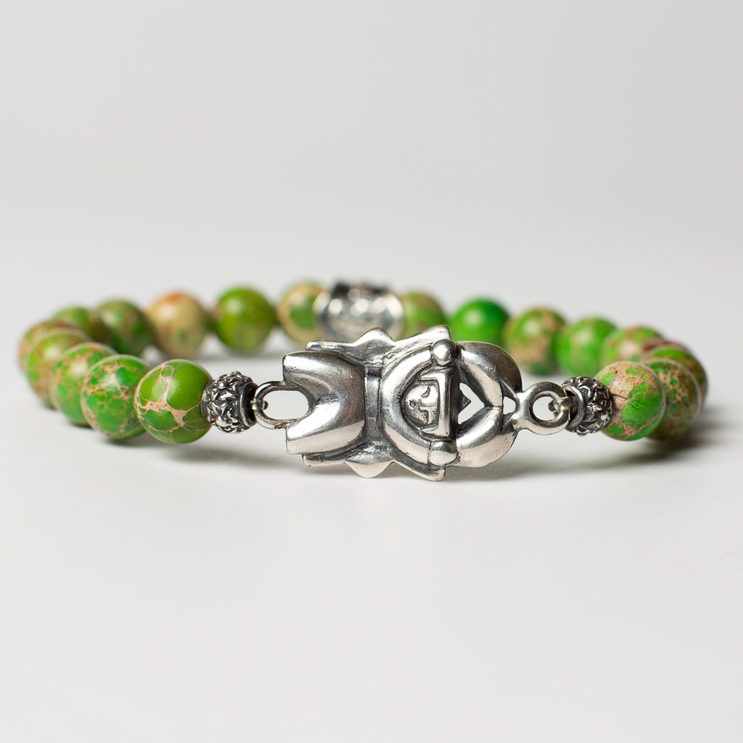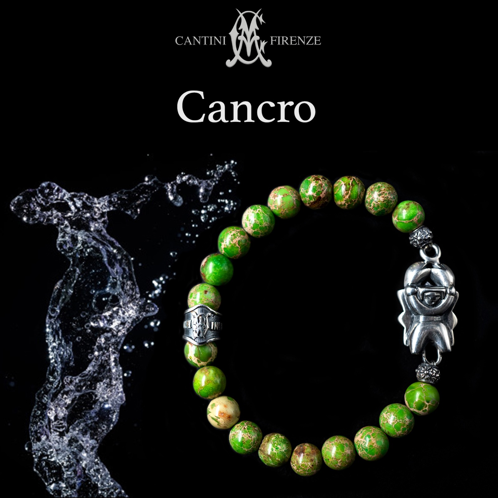 Bracciale in pietre naturali di Turchese verde 8mm , con accessori in Argento 925 raffigurante microscultura del segno del Cancro interamente fatto a mano