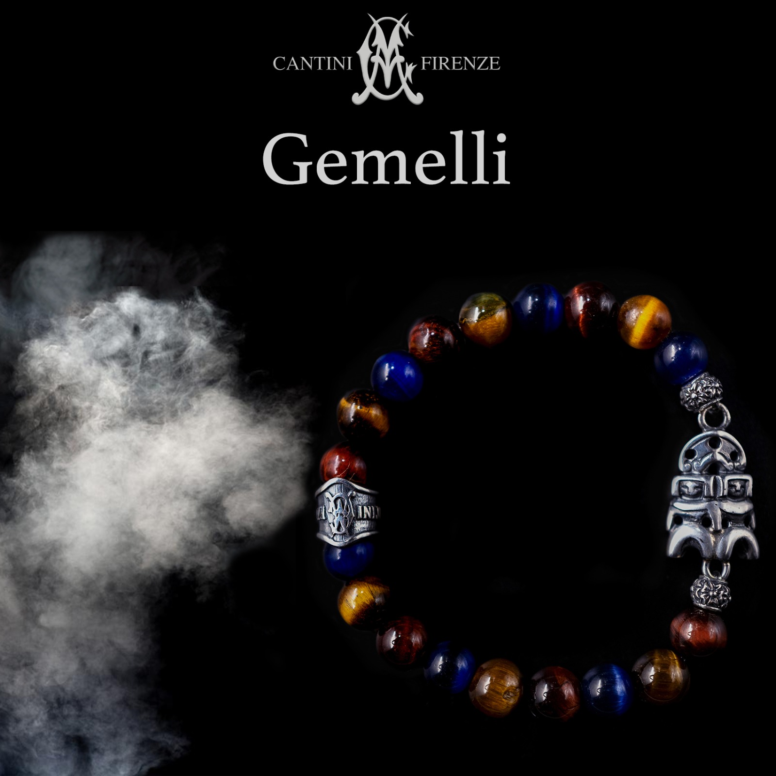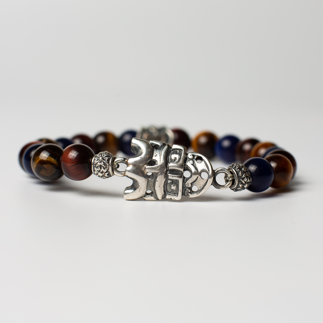 Bracciale in pietre naturali di Occhio di tigre 3 colori 8mm , con accessori in Argento 925 raffigurante microscultura del segno dei Gemelli interamente fatto a mano