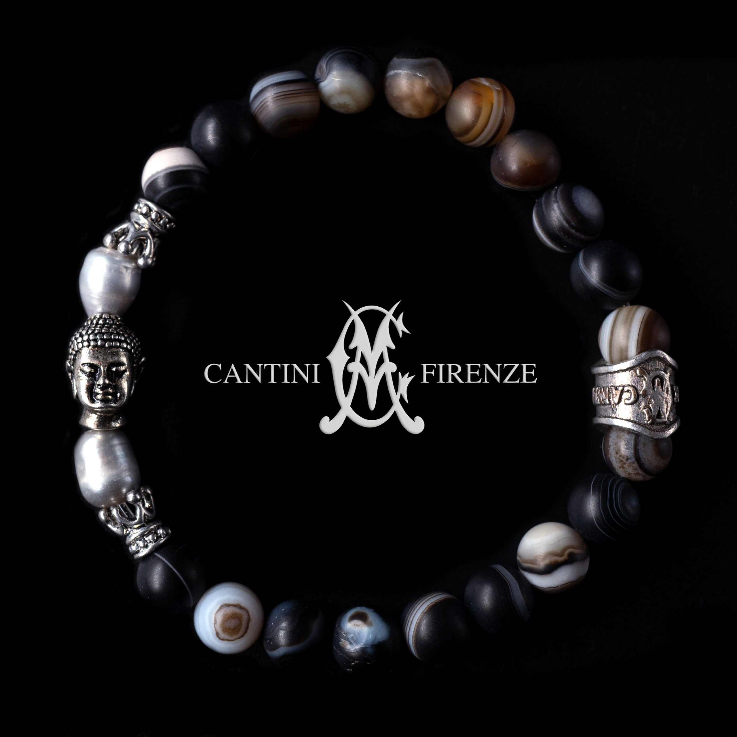 Bracciale in agata Tibetana 8mm , perle di fiume , elementi bronzo bianco ,