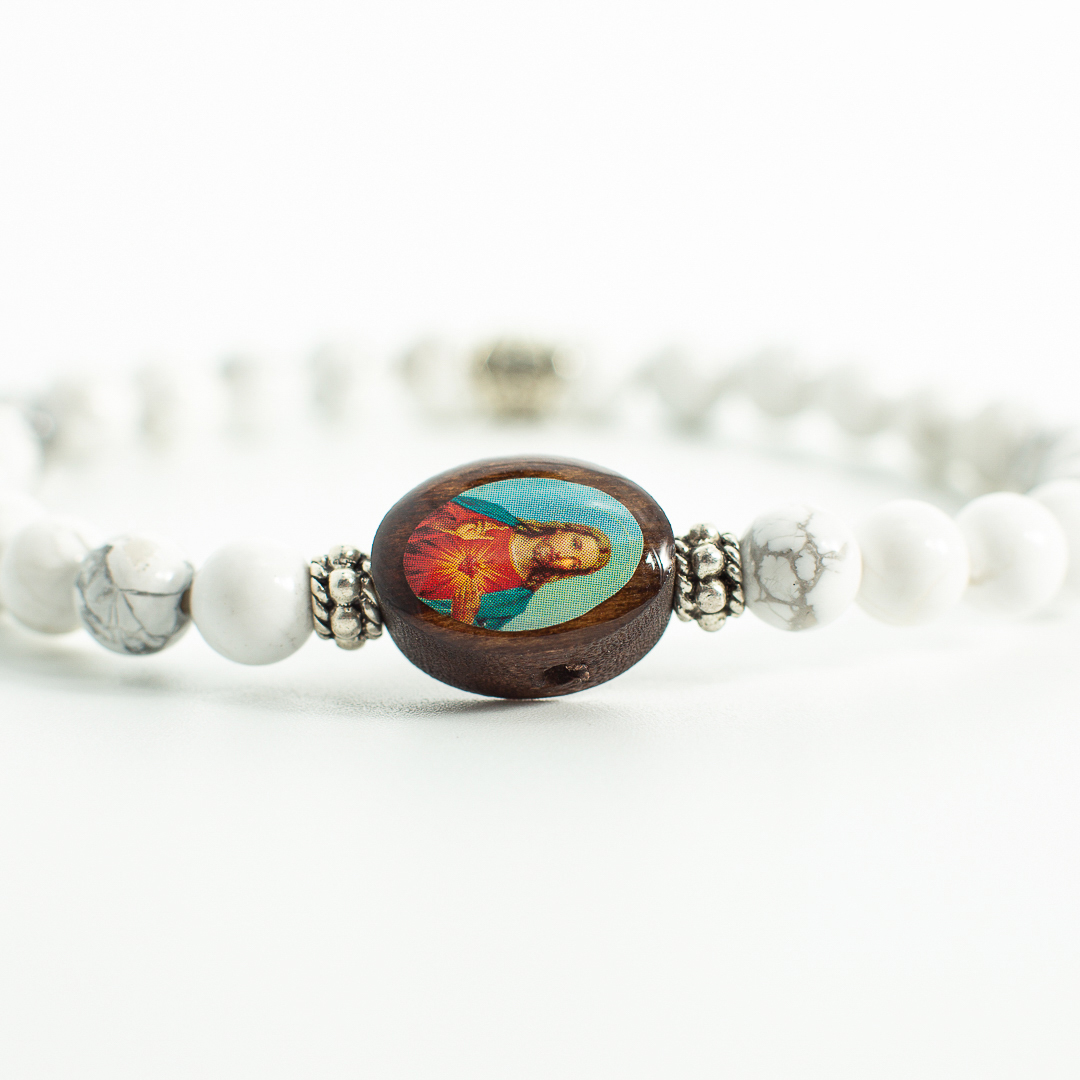 Bracciale di Howlite bianca 6mm , con accessori in bronzo bianco e cuore in vetro e icona in legno “Jesus”